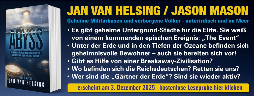 „ABYSS: Geheime Militärbasen und verborgene Völker – unter der Erde und in den Tiefen der Meere„. Dieses Buch enthüllt die Geschichte einer geheimen, abgespaltenen Elite, die in unterirdischen Basen lebt, abgeschirmt von Öffentlichkeit und demokratischer Kontrolle, und dennoch parallel zu uns auf der Oberfläche existiert. Whistleblower wie Catherine Austin Fitts zeigen, wie transdimensionale Intelligenzen und globale Finanzoligarchien die Geschicke der Menschheit lenken. Erfahren Sie von den luxuriösen Bunkeranlagen der Tech-Eliten, die sich auf ein bevorstehendes, mysteriöses Ereignis – The Event – vorbereiten. Entdecken Sie Unterwasserbasen, uralte Tunnelsysteme und verborgene Zivilisationen – von den verschollenen Kulturen der Lemurier und Atlanter bis zu modernen Deep Underground Military Bases (DUMBs). Lernen Sie Commander X kennen, der über fremde Intelligenzen im Erdinneren berichtet, welche die Menschheit beobachten und manipulieren. Die Autoren führen Sie in die Welt der UFOs, die möglicherweise von Zeitreisenden gesteuert werden, und erfahren Sie von USOs – den schattenhaften Herrschern der Ozeane, die von maritimen Spezialkräften verfolgt werden. Geheime Alien-Allianzen, antike Megastrukturen unter Gizeh sowie archäologische Geheimnisse aus Nazca und Paracas liefern Hinweise auf eine verborgene außerirdische Präsenz und hochentwickelte Technologien. Dieses Buch beleuchtet zudem, wie Transhumanismus als Instrument neuer Herrschaftsformen genutzt wird, während Großforschungsprojekte wie am CERN Portale zu Paralleluniversen eröffnen. Alte Mythen verschmelzen mit modernen Verschwörungstheorien und fordern das klassische wissenschaftliche Weltbild heraus. Jan van Helsing und Jason Mason ermöglichen durch ihre Recherchen einen Einblick hinter die Kulissen verborgener Mächte, okkulter Strukturen und transzendenter Dimensionen – eine Einladung, die Grenzen des Bekannten zu überschreiten und die verborgene Realität unserer Welt zu erkunden.